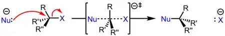 An SN2 reaction occurs when a nucleophile displaces a leaving group residing on a molecule from the backside of the leaving group. This displacement or substitution results in the formation of a substitution product with inversion of stereochemical configuration. The nucleophile forms a bond with its lone pair as the electron source. The electron sink which ultimately accepts the electron density is the nucleofuge (leaving group), with bond forming and bond breaking occurring simultaneously at the transition state (marked with a double-dagger). The rates of SN2 reactions are dependent on the concentration of the haloalkane and the nucleophile.