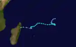 The MFR continued tracking the circulation, and Hely turned back to the west on March 24 due to a strengthened ridge following Gasitao's dissipation. On the next day, it briefly re-intensified into a tropical storm, only to weaken to tropical depression status again on March 26. Moving toward Madagascar, Hely passed north of Tromelin and again became a tropical storm on March 27,[26][27] the same day that the JTWC reissued advisories.[2] Later that day, the storm made landfall just north of Île Sainte-Marie, and it weakened once again over land.[27] Wind gusts in Madagascar reached 80 km/h (50 mph).[15] On March 29, the storm emerged into the Mozambique Channel near Besalampy, and failed to re-intensify significantly as it moved southwestward. Two days later, Hely turned sharply to the southeast, sparing it moving ashore Mozambique. The MFR ceased tracking the system as a tropical cyclone on April 2, although the circulation was still visible as late as April 5, 21 days after it originated.[26][27]