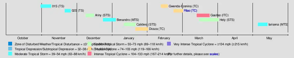 Cyclone Filao was the most notable storm of the season, originating in late February off northern Madagascar. It ultimately struck Mozambique on March 1, where it killed about 100 people and left $10 million in damage (1988 USD). In January, both tropical storms Calidera and Doaza crossed Madagascar, the latter of which helped end a drought. Long-lasting Tropical Storm Hely also struck the country in March. The strongest cyclone of the season was Gasitao, which formed at the same time as Hely and attained peak winds of 150 km/h (93 mph). The season ended when Tropical Storm Iarisena dissipated northeast of Madagascar in the middle of May.