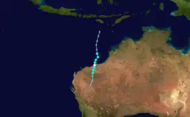 Severe Tropical Cyclone Heidi was a small and moderately-powerful tropical cyclone that struck Western Australia in January 2012. The seventh tropical low, third tropical cyclone, and second severe tropical cyclone of the 2011–12 Australian region cyclone season, Heidi developed from a tropical low that formed to the south of Indonesia on 9 January, before strengthening into a Category 1 tropical cyclone on the following day. Tracking southward towards the Pilbara coast in a favourable environment, Heidi rapidly intensified and attained Category 3 severe tropical cyclone status on 11 January. After making landfall at peak intensity later that day with estimated winds of 150 km/h (95 mph), Heidi rapidly weakened, dissipating over Western Australia by 13 January.