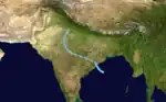 Deep Depression Seven existed from September 8 to September 15.[9] The storm moved from east to west throughout its lifetime. It formed on September 8 in the western Bay of Bengal and made landfall on eastern India on September 8. The depression crossed India and traced the western coast of the country from September 10 to September 14, making two sharp turns along the way. The storm dissipated in the extreme northern Arabian Sea on Septemebr 15.