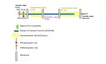 TMEM261 contains a domain of unknown function, DUF4536 (pfam15055), predicted as a helical membrane spanning domain about 45aa (Cys 47- Ser 92) in length with no known domain relationships.[9][10] Two further transmembrane helical domains are predicted of lengths 18aa (Val 52-Ala 69) and 23aa (Pro 81-Ala 102]).[11][12] There is also a low complexity region spanning 25aa (Thr 14-Ala 39).[13] The tertiary structure for TMEM261 has not yet been determined. However, its protein secondary structure is mostly composed of coiled-coil regions with beta strands and alpha helices found within the transmembrane and domain of unknown function regions. The N-terminal region of TMEM261 is composed of a disordered region[14][15] which contains the low complexity region[13] that is not highly conserved amongst orthologues.[16][17]