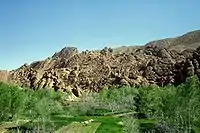 The Dadès River rises in the High Atlas and then turns south crossing through the Dadès Gorges, then westward between the High Atlas and Anti-Atlas mountain ranges. The river finally meets the Ouarzazate River, which then enters Draa River.