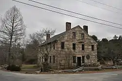 Visible elements of the site include the early 19th century stone dam, and the stone house at the corner of Putnam and Stone Roads. The house was built after the 1814 purchase, and is basically Georgian in style, with a gabled roof and five-bay main facade. Also found at the site are foundational remnants of the mill, including portions of the tailraces of both the grist and cotton mills. Arrayed near the stone house are foundational remains of some of the worker housing.[4]
