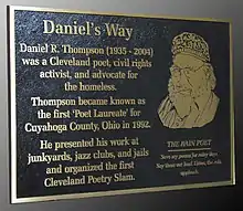 Thompson promoted the idea of renaming the University Circle portions of East Blvd. after Hart Crane and Langston Hughes. A street was named for him after his death, Daniel's Way can be found in downtown Cleveland.[5] Cleveland poet Chris Franke failed to paint his house after being ordered by the city to do so. Thompson arranged a creative solution where Franke did community service: reading his poems to a soup-line audience at a homeless shelter.[6]