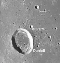 Daniell is a lunar impact crater located in the southern half of the Lacus Somniorum. To the south-southeast is the much larger crater Posidonius. The Rimae Daniell rille system are to the west of Daniell crater.