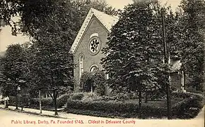 Darby Free Library is a public library at 1001 Main Street in Darby Borough, Delaware County, Pennsylvania. Founded as the Darby Library Company in 1743 – just 12 years after Benjamin Franklin organized the Library Company of Philadelphia – it remains one of the oldest libraries in the United States. Although it was a subscription library until 1898, it claims to be "the oldest library in the United States in continuous service." The library celebrated its 275th anniversary in 2018.