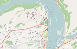 Dartmouth Harbour (also Dart Harbour) is a natural port located in Dartmouth, Devon, England. It is situated at the mouth of the River Dart on the English Channel.[2] Bayard's Cove Fort is a small fort, which was built to defend the harbour's entrance. The crafts which dock at the port are mainly local fishing vessels, naval ships and luxury yachts; warships routinely visit the harbour.[3] The River Dart is navigable from Dartmouth to the old weir location at Totnes.