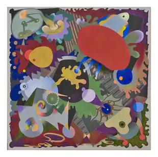 When Sharpe left SAIC, he was creating complex, vibrant abstract works noted for their bright color, tightly clustered compositions, and adventurous mix of formal strategies.[22][28] Paintings such as Three (1970, above) combined overlapping colored and patterned biomorphic and abstract shapes that critics wrote, exploded across the canvas before being contained at the edges with a single-colored ground.[2][3] Dennis Adrian described the paintings as containing so much visual incident that viewers could neither take in their totality, nor "exhaust their delights," while Jane Allen noted their "kaleidoscopic effect of moving forms and colors."[29][18]