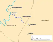 Deckers Creek is a 24.6-mile-long (39.6 km)[1] tributary of the Monongahela River that runs through north-central West Virginia. It begins west of Arthurdale and flows southeast, then north, then northwest towards Morgantown, where it empties into the Monongahela River.[2] The stream has been contaminated by various sources, though largely due to extractive resource mining and improper sewage disposal. Recently, a conservation effort has been launched and conditions are improving, as the area continues to develop for recreational purposes.