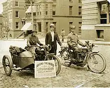 Crewe began her trip on June 24, 1914, and journeyed from Waco to Dodge City, Kansas for motorcycle races. She then went to St. Louis, Missouri for the annual convention of the Federation of American Motorcyclists.[1] In Chicago she met C. H. Lang, Harley-Davidson's first motorcycle dealer. She reached Milwaukee in the autumn where she was feted by the stenographers who worked at the Harley-Davidson offices. Crewe and her dog arrived in New York City in December 1914 after traveling 5,378 miles through ten states over six months. She detailed her travels for the Harley-Davidson Dealer and wrote the names of the locations she had traveled through on her sidecar.