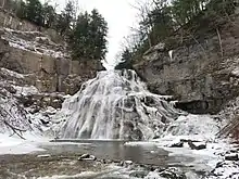 Delphi Falls is a two-tiered waterfall located in the 66 acres (27 ha) Delphi Falls Park on the East Branch of Limestone Creek southeast of Delphi Falls and west-southwest of Union. The lower falls are 62 feet (19 m) tall, while the upper are 54 feet (16 m). In 2018 the land, which had been privately owned and closed to the public for around fifty years, was purchased with contributions from a retired professor at Syracuse University who lived in Manlius, New York, (contribution of $750,000) and the Madison County government(contribution of $150,000).[1][2][3]