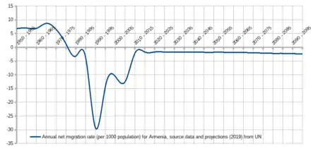 According to 2019 UN data, the emigration rate averaged annually around 1.7 per 1000 inhabitants in years 2015–2020 and is expected to remain the same until year 2045. These are below average emigration rate of 11.5 per 1000 in years 2000–2010 and even below the emigration rate of 3.2 per 1000 in years 1980–1985.[47]