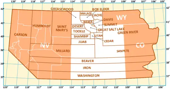 When Desert County, Utah Territory was created March 3, 1852[1][2][3][4] it extended into present-day Nevada from the shore of the Great Salt Lake on the east to the western edge of the Great Basin in California between Weber and Tooele counties in Utah Territory.