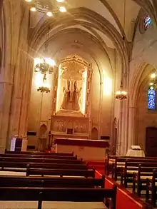 At the altar is a major sculptural group of the Crucifixion by John Angel, the British-born sculptor, medallist, and lecturer.[13]