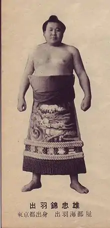 Dewanishiki Tadao (July 15, 1925 – January 1, 2005) was a sumo wrestler from Tokyo, Japan. His highest rank was sekiwake. He won ten kinboshi or gold stars for defeating yokozuna during his long top division career, which only four wrestlers have bettered. He also won four special prizes. After his retirement he was a coach at Dewanoumi stable.