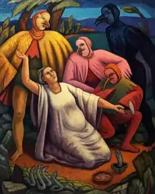 Despite earning a distinction in sculpture at university and subsequent awards for her sculptural work, Dean turned to painting after emigrating to Canada for lack of resources and space. Her initial dedication to abstraction gradually gave way to increasing realism. The stylistic influence of the Renaissance masters and modernists such as Van Gogh or Balthus are evident in her figural work.[2] She often casts everyday characters into mythological or spiritual narratives drawn from diverse cultures and periods as in "Innana Descending into the Underworld" (1986), "The Ritual" (1986) or her self-portrait as "Diana the Huntress" (1994).