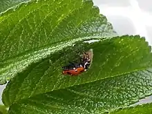 The mature female wasp seeks out adult female ladybirds, although they will sometimes oviposit into a male adult or larval instar.[4][6] One egg is planted in the host's soft underbelly. The wasp larva hatches after 5–7 days into a first instar larva with large mandibles and proceeds to remove any other eggs or larvae before beginning to feed on the ladybird's fat bodies and gonads.[7]