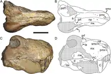 Dinogorgon was one of the largest species of rubidgeinae, with the skull length of nearly 40 centimetres (16 in), almost as large as Rubidgea had.[8] It was a formidable predator, and likely preyed on reptiles and smaller therapsids.[9][10] Like more derived rubidgeines, Dinogorgon had a number of bosses on its skull, likely to reduce the stresses caused by struggling prey. Its snout was deep but narrow, similar to Aelurognathus,[11] but narrower than Rubidgea and Clelandina. It had 4 to 5 upper and lower postcanine teeth, which further distinguishes it from Rubidgea.[12][13] Three subspecies are currently recognized in the genus: D. rubidgei, D. quinquemolaris, and D. pricei.