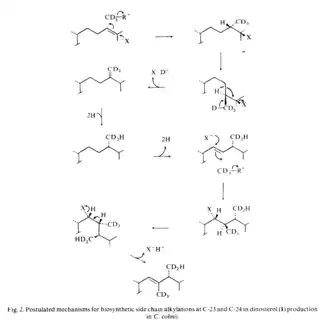 In a study on dinosterol side chain synthesis in the marine heterotrophic dinoflagellate, crypthecodinium cohnii, the dinoflagellates were cultured with methionine-[CD3]. GC-MS analysis revealed that the C-23 methyl group contained three deuterium atoms that were introduced by transmethylation from methionine. The C-24 methyl group contained only two deuterium atoms, consistent with a 24-methylenesterol intermediate, which is reduced to the resulting 24-methyl side chain.[5] This mechanism has been previously reported in fungi,[6] a chrysophyte alga[7] and a diatom.[8] Importantly, no deuterium was incorporated into cholesterol or cholesta-5,7-dien-3β-ol, which are the major 4-methyl-sterols in crypthecodinium cohnii. A suggested biosynthetic mechanism for side chain alkylations at C-23 and C-24 in dinosterol has been proposed.[5]