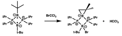 Diphosphadiboretanediyls exhibits reactivity similar to radicals, behaving as diradical intermediates.[8] The compounds have been shown to perform chloride abstraction from deuterated chloroform, trans-addition of trimethyl tin hydride, and formation of bicyclo[1.1.1] structure with selenium. Reactivity is displayed towards bromotrichloromethane where radical activity induces formation of boron-containing spiro-compound from the tert-butyl group. This cyclic formation maintains the diphosphadiboretane ring structure.