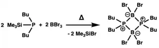 The first suggested synthesis of a diphosphadiboretane compound was with phosphinoarylboranes dimerization in 1961.[3] Concurrently, a diphosphadiboretane was determined to be produced from the reaction with phosphinosilanes and boron halides.[4][5] The following thermolysis treatment formed boraphosphenes by cleavage of the σ P-Si bonds. Dimerization of these compounds are highly favored (upward to 90 kcal mol−1), which results in isolated diphosphadiboretanes.[1] Alternative routes of synthesis utilizing facile leaving groups have also been discovered including hydrogen halide and organylphosphane elimination to obtain the monomer precursors. Treatment with boron halides with lithium phosphides have also been found to lead to monomers which then dimerize into the diphosphadiboretanes.[6]