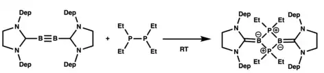 In 2021, it was found that the phosphination of diboryne using diphosphate would slowly convert to diphosphadiboretane in solution.[7]