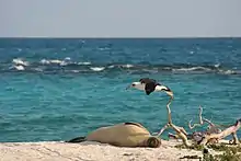 After the Battle of Midway in WW2, Tern island was made into airstrip, nicknamed the "coral carrier" and would be between Midway island and the main Hawain island. Tern was protected by thousands of feet of double wall steel sea wall, which has kept its stable in size. However, by 2000 the seawall was trapping marine life and Congress authorized some repair work. The seawall is noted for trapping seals and seals beause there are holes where life gets into the gap between the two walls but cannot escape.[44][39][25] In 2023, the entrapment of seals in the decayed seawall was noted during a visit to the island.[37]