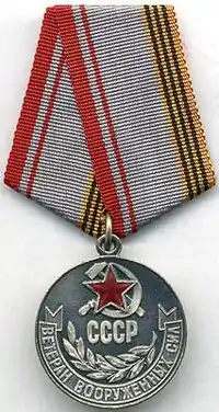 Order "For Service To The Homeland In The Armed Forces of the USSR" 3rd class Орден «За службу Родине в Вооружённых Силах СССР» третьей степени Orden «Za službu Rodine v Vooruzhennykh Silakh SSSR» tret'ej stepeni |