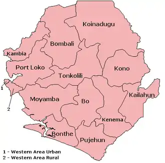 The provinces of Sierra Leone are divided into 16 districts, as of July 2017.[1][2] Previously, the country was divided into 14 districts. The Western Area is divided into two districts. Sierra Leone's capital Freetown is located in the Western Area of the country and its makes up the Western Area Urban District.