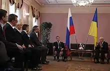 In 2008, Rogozin was appointed by the Medvedev–Putin duumvirate as the Russian ambassador to NATO. As Russia's NATO envoy, he was heavily opposed to Ukraine and Georgia becoming members of NATO. After the two countries were denied membership of the NATO Membership Action Plan, he claimed, "They will not invite these bankrupt scandalous regimes to join NATO ... more so as important partnerships with Russia are at stake".[10] For such words, he was criticized by some Ukrainian and Georgian officials. A former Ukrainian envoy to NATO, Ihor Sahach, said, "In my opinion, he is merely used as one of cogs in the informational war waged against Ukraine. Sooner or later, I think, it should be stopped". The envoy also expressed surprise at Rogozin's slang words: "It was for the first time that I heard such a higher official as envoy using this, I don't even know how to describe it, whether it was a slang or language of criminal circles ... I understand Russian, but, I'm sorry, I don't know what his words meant".[11] The Foreign Minister of Ukraine Volodymyr Ohryzko stated that he did not regard the statement as serious.[11]