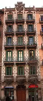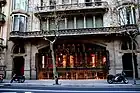 | 1902 | Casa Lleó Morera[24] | Passeig de Gràcia, 35 | Remodelling of the former casa Rocamora of 1864. It contains rich ornamentation by Lluís Brú i Salelles in mosaics, Antoni Serra i Fiter in ceramics, Antoni Rigalt i Blanch in stained glass, with furniture and joinery by Gaspar Homar i Mezquida and Josep Pey i Farriol, as well as sculptures by Eusebi Arnau i Mascort. | Fair | ![]() |
