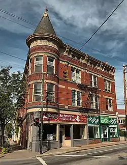 The Domhoff Buildings are a pair of historic commercial buildings in the Northside neighborhood of Cincinnati, Ohio, United States. Designed by architect W.W. Franklin, the two buildings are located on one corner of the junction of Hamilton and Chase Avenues, that neighborhood's most important intersection.[2]