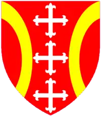 Gules between two flaunches voided Or three crosses flory in pale Argent.