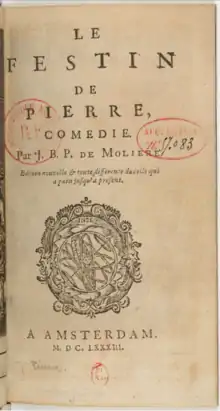 Media related to Dom Juan ou le Festin de pierre at Wikimedia Commons- Le Festin de Pierre, comedie. Par J.B.P. de Moliere, edition nouvelle & toute differente de celle qui a paru jusqu'à present. A page-by-page view of the antique book that contains the text of the play as it was published in Amsterdam in 1683