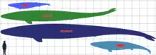 Dorudon ("spear-tooth") is a genus of extinct basilosaurid ancient whales that lived alongside Basilosaurus 40.4 to 33.9 million years ago in the Eocene. It was a small whale, with D. atrox measuring 5 metres (16 ft) long and weighing 1–2.2 metric tons (1.1–2.4 short tons). Dorudon lived in warm seas around the world and fed on small fish and mollusks. Fossils have been found along the former shorelines of the Tethys Sea in present-day Egypt and Pakistan, as well as in the United States, New Zealand and Western Sahara.[1]