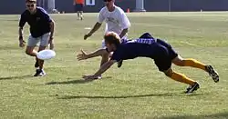 Ultimate (also called Ultimate Frisbee) is a competitive non-contact team sport. The object of the game is to score points by passing the disc to a team member in the opposing team's end zone. Players may not move about the field while holding the disc. Catching is done with one hand or both hands on the rim or with hands simultaneously on the top and bottom, sometimes referred to as a clap-catch. When one-hand catching on the rim, care must always be taken in hand placement and making sure to catch on the correct side of the disc, according to which way the disc is spinning. One side will tend to spin out of your hand, while the other side will spin into your hand, making for a more secure catch. Many players avoid this problem by catching with both hands when possible. The most popular throws used in a game of ultimate are backhand, sidearm/forehand, hammer and scoober. Being a deep threat, with multiple throwing techniques and the ability to pass the disc before the defense has had a chance to reset, is always optimal. Some players use a throw and catch freestyle practice to help improve their ultimate handling skills.[9] The game was invented in 1968 as an evening pastime by Jared Kass. Ultimate is distinguished by its Spirit of the Game - the principles of fair play, sportsmanship, and the joy of play. USA Ultimate (USAU) and Ultimate Canada are the rules and sanctioning organizations for ultimate in the US and Canada. While USAU and WFDF rulesets differ, the organizations have been working together over the past 3 years to bring the rulesets into closer alignment. The American Ultimate Disc League (AUDL) and Major League Ultimate (MLU) are the first men's semi-professional ultimate leagues. The Major League Ultimate (MLU) ceased operation on December 21, 2016.[10] In 2019 the Premier Ultimate League, ultimate's first Women's semi-pro league launched followed by the Western Ultimate league in 2020. Currently the highest level of International Ultimate is the World Games followed by the World Ultimate and Guts Championship.