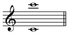 In music, a fifteenth or double octave, abbreviated 15ma, is the interval between one musical note and another with one-quarter the wavelength or quadruple the frequency. It has also been referred to as the bisdiapason.[1] The fourth harmonic, it is two octaves. It is referred to as a fifteenth because, in the diatonic scale, there are 15 notes between them if one counts both ends (as is customary). Two octaves (based on the Italian word for eighth) do not make a sixteenth, but a fifteenth. In other contexts, the term two octaves is likely to be used.