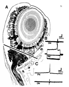 The work that won McMahon the Donald B. Lindsey Prize for PhD candidates involved locating and isolating specific regions of the eye that possessed circadian rhythms in Bulla gouldiana. Under the mentorship of Gene Block, McMahon recorded from the basal retinal neurons (BRNs), a homogenous group of neurons that are 15-25μm in diameter, of the snail's eye and found that they could entrain to light/dark cycles, and even oscillate in constant darkness with a consistent intrinsic period.[11] The BRN was later shown to entrain to light/dark cycles, and control physiological and behavioral oscillations within the entire organism.[12] McMahon and Block found an increase in firing frequency and depolarization of the BRNs during the day, but the opposite at night.[12] In addition, electrical activity between action potentials in the optic nerve and the firing of the BRNs were shown to share a 1:1 correlation.[13] In 1984, McMahon also demonstrated that the surgical removal of the photoreceptor layer failed to disrupt circadian rhythm in the Bulla eye, while the removal of the BRNs abolished circadian rhythm. His discovery that a fragment of Bulla retina containing as few as six intact BRN somata were sufficient for circadian rhythmogenesis further supported the BRNs as circadian pacemakers.[11][12] Later work by Dr. Stephan Michel using a surgical reductionist approach provided further evidence that isolated BRNs were capable of circadian oscillations in their conductance.[14]