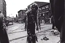 Brother Blue wore a predominantly blue ensemble, sporting blue turtlenecks or collared shirts and blue pants. He frequently wore a blue beret on which butterfly pins, some with rhinestones or sea opals, were affixed. He wore a sash emblazoned with "BROTHER BLUE STORYTELLER" in his capacity as Official Storyteller of Cambridge, Massachusetts.[6] Ribbons laced his shoulders, arms, elbows, wrists, knees, and ankles and he was known to carry bright blue balloons. Inspired by Judaic, Vedic, African traditions, he often appeared barefoot or would take off his shoes in the early course of a performance to touch earth as sacred ground.[4]