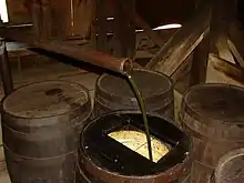 Edwin Drake, a former conductor for the New York and New Haven Railroad, invested $200, his entire savings, into the Pennsylvania Rock Oil Company.[9] Drake became more involved in the company and traveled to Titusville, Pennsylvania and the Brewer and Watson Farm in December 1857. His report prompted Bissell and Eveleth to organize the Seneca Oil Company in Connecticut in March 1858 and to place Drake in charge of producing petroleum.[7][9] Because Drake decided that drilling in the manner of salt wells would yield more petroleum than conventional digging, he hired William A. Smith, a Tarentum, Pennsylvania, blacksmith and salt-well driller, to aid in the endeavor.[7] An engine house and derrick were constructed, and Drake purchased a 6-horsepower (4.5 kW), horizontal steam engine. The steam engine was used to ram the drill through the soil until it reached bedrock 32 feet (10 m) down. After it was found that groundwater would cause the walls of the hole to collapse, Drake acquired 50 feet (20 m) of cast iron pipe to stabilize the hole.[9] After reaching bedrock, Drake and Smith were able to drill at a rate of 3 feet (1 m) per day.[7] Drake's colleagues back in Connecticut gave up on finding any oil by April 1859 and after spending $2,500, Drake took out a $500 loan to keep the operation going.[10] The drill reached its maximum depth of 69.5 feet (21.2 m) on August 27, 1859. Smith visited the well the next day and found oil visible on top of the water 5 inches (13 cm) from the top of the well.[9] The original structures at the well caught fire in October 1859 and were rebuilt by Drake a month later. The well produced 12 to 20 barrels (2 to 3 m3) a day, but, after the price of oil plummeted from the resulting boom, it was never profitable.[10] The well stopped producing in 1861 and the Seneca Oil Company sold the property in 1864. The derrick was moved in 1876 to the Centennial Exposition in Philadelphia.[11]