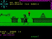 One area had to be censored before release. There is an empty area in the centre of the city, the pleasure quarter "Iomain" which was originally intended to be a brothel called "Lady Q's" and would have opened into a whole red-light district. This was replaced with a sign saying "Forbidden".[8] Dun Darach was launched for the ZX Spectrum in 1985. It was ported to the Amstrad CPC later that year. Carter remarked that it took ten days to do the conversion for the system.[10] It was re-released by different software companies; Hewson Consultants' Rebound imprint in 1986, Gremlin Graphics in 1986 as part of their 4 Crash Smashes compilation, and on cover tapes in issues of Sinclair User and Your Sinclair.[11]