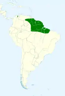 The dusky parrot's natural habitat is humid lowland forest. Its range is northern South America, and is centered on the Guiana countries, the Guiana Shield, and the northeastern Amazon Basin. It is mostly limited on the west in central-eastern Venezuela by avoiding the Orinoco River itself, but living on its eastern side, from near the Caribbean coast to about 1000 km upstream. To the west a small disjunct group lives west of Lake Maracaibo on the Colombia-Venezuela border.