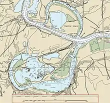 The Dutch Gap Canal was named for its location at Dutch Gap, which was formerly a neck of land that joined Farrar's Island to the mainland. The James River around Farrar's Island, from Drewry's Bluff to the confluence of the Appomattox River below Bermuda Hundred, originally had a number of meandering loops. The Dutch Gap was the isthmus between the narrowest of these loops. Here, the James River on the west bank of the isthmus created what was called the "Seven Mile Loop"[note 1] that formed Farrar's Island before returning to the east bank.[2] However, the distance between the east and west banks at this point was less than 200 yards wide.[3] and the elevation ranged from 3 feet to 39 feet above the level of the river.[1]