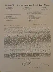Warriner was founder and President of the Michigan Branch of the American School Peace League on October 28, 1910. He conducted the meeting at the 99th semi-annual Teachers Association of Gratiot County.[8] As such, he urged public school teachers in Michigan to educate its young people about the "new world order" and international organization aimed at peace that were ushered in by the early Hague Peace Conferences (of 1899 and 1907). Warriner spoke publicly on peace prior to the U.S. entry into the Great War[9][10][11] and was engaged in a public debate with Governor Chase Osborn about the propriety of introducing rifle shooting in schools, which the Governor endorsed.[12]