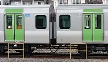 The E235 series design was developed from the earlier E233 series trains, and like the E233 and E231 series trains, the new E235 series trains have stainless steel bodies.[1] The exterior styling was overseen by the industrial design firm Ken Okuyama Design.[2] Baggage racks and hand-holds have been lowered 5 cm (1.97 in) for easier access and the seats are 1 cm (0.39 in) wider than previous trains. The car interiors also have up to 36 digital monitors for various informational displays. The window behind the drivers cab has been lowered so children can get a better view of the operator of the cars. The temperature of each car is also monitored; the system can predict the number of passengers at upcoming stations and adjust the temperature for passenger comfort. This information is also communicated to a smart phone application, allowing customers to choose in which car to ride based on their temperature preference.[3] In 2017, the E235 series received the Laurel Prize.[4]