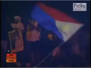 ![]() A still from an episode of The Probe Team that features Estrada loyalists marching toward Malacañang Palace, calling for the resignation of President Gloria Macapagal Arroyo. Note that the Filipino flag is flown with the red field upwards, a Philippine flag usage during a state of war. | |||
