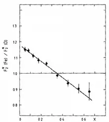 - 1 2 3 J.J. Aubert; et al. (1983). "The ratio of the nucleon structure functions F2N for iron and deuterium". Phys. Lett. B. 123B (3–4): 275–278. Bibcode:1983PhLB..123..275A. doi:10.1016/0370-2693(83)90437-9.