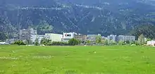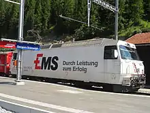 Between Chur and Domat/Ems runs the narrow-gauge railway line Chur-Domat/Ems of the Rhaetian Railway, which has three tracks since December 1959.[14] Through this, standard gauge freight trains can reach the Ems-Chemie. The RhB stop, Ems factory, serves the factory site directly. There are ideas to introduce normal passenger services to Ems factory in the future.[15] For this purpose, however, the entire track system would have to be extended in three tracks to Ems factory. There is no proposed funding for this project.