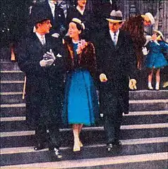 The Bynoes exit the church in the company of another man. Tabby tries to grab the orchids but the Bynoes' companion wards him off. So Tabby ducks away into the crowd and begins to stalk them as the three walk up the avenue. Archie has been able to capture much of the action on film.